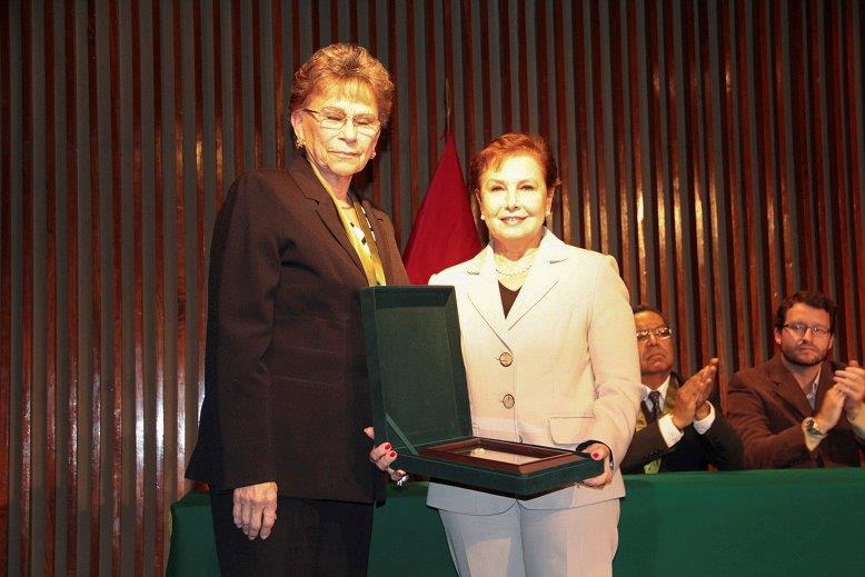 Dña. Bárbara Prado, presidenta de ANAR Perú (derecha) recibiendo la condecoración