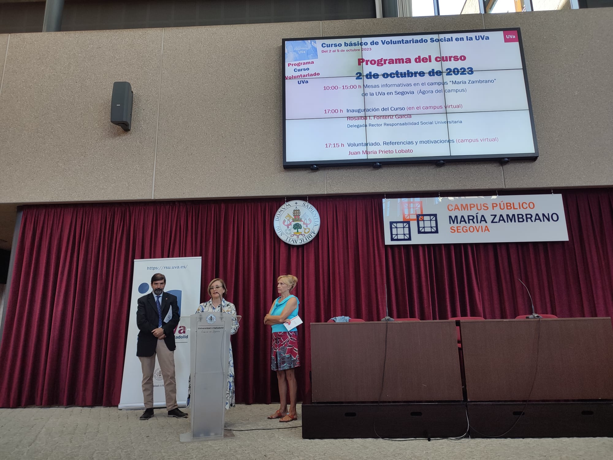 El primer día la experiencia de voluntariado se ha acercado a los estudiantes en el ágora del Campus María Zambrano de Segovia, durante la mañana de 10 a 15 horas, iniciando la jornada con la inauguración de mano de Agustín García, vicerrector del campus, acompañado de la delegada del Rector para la Responsabilidad Social Universitaria, Rosalba I. Fonteriz y Nélida Cano, presidenta de la Plataforma de Voluntariado Social en Segovia.