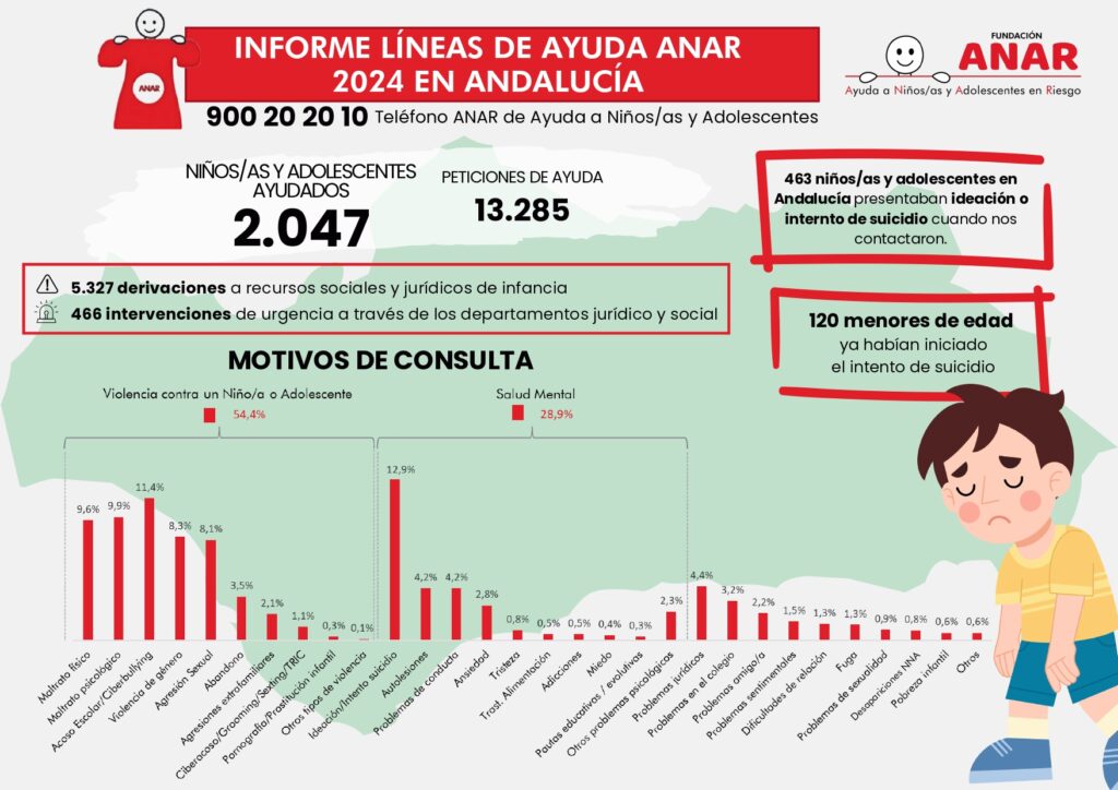 • 463 menores de edad atendidos por las Líneas de Ayuda ANAR en Andalucía durante el pasado año presentaban ideación suicida, de ellos, 120 habían iniciado el intento de suicidio.