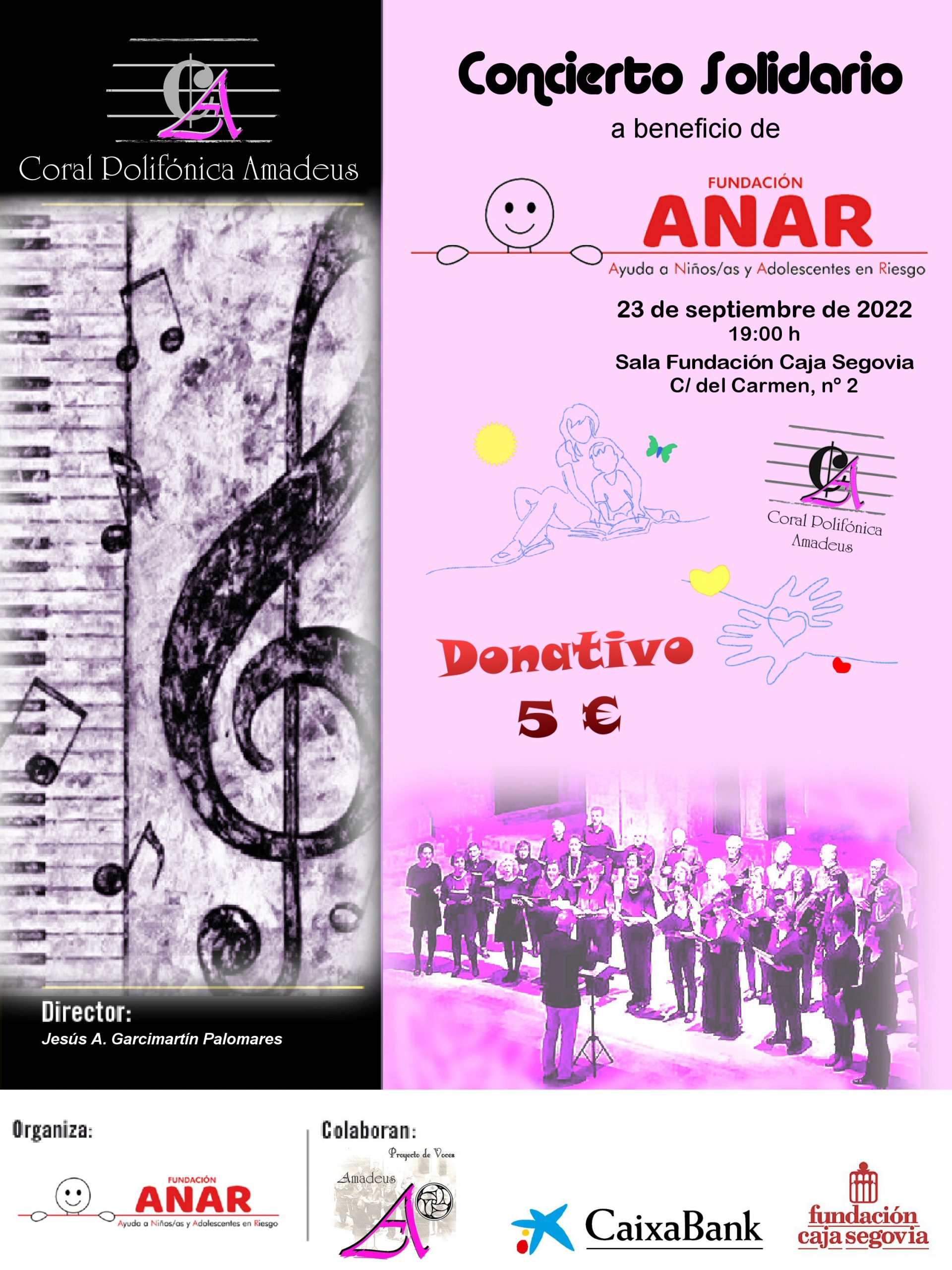 Jesús Antonio Garcimartín Palomares, director de la Escuela de Música AMADEUS de Segovia, es, asimismo, el director y coordinador de Proyecto de Voces Amadeus, de la que forman parte Coral Polifónica Amadeus y Camerata Regina Mater. Desde 2013, esta coral ha actuado, con notable éxito, por toda la provincia de Segovia, habiendo participado varios años en el homenaje a Antonio Machado en su Casa-Museo, concurrido en Certámenes de Villancicos del Ayuntamiento de Segovia y en programas culturales de la Diputación Provincial segoviana. Además es importante destacar su vertiente solidaria, habiendo colaborado con organizaciones como Cáritas Diocesana de Segovia (con un reciente concierto por las familias ucranianas), Manos Unidas, la Asociación Clamores Pro-Salud Mental y ahora con la Fundación ANAR.
