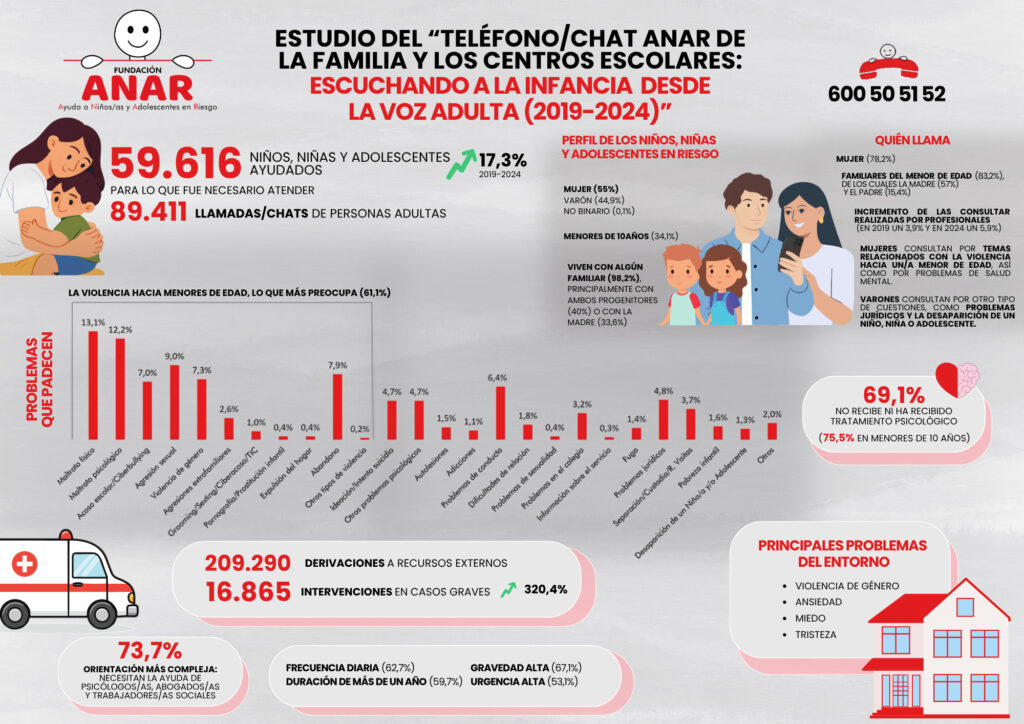 Fundación ANAR ha presentado el Estudio del Teléfono/Chat ANAR de la Familia y los Centros Escolares: “Escuchando a la infancia desde la voz adulta (2019-2024)”, elaborado por el Centro de Estudios e Investigación ANAR, en el que analiza los 59.616 casos de menores de edad en riesgo ayudados a partir de las 89.411 peticiones de ayuda realizadas en ese período por parte de personas adultas al Teléfono ANAR de la Familia y los Centros Escolares, 600 50 51 52, y al chatanar.es.