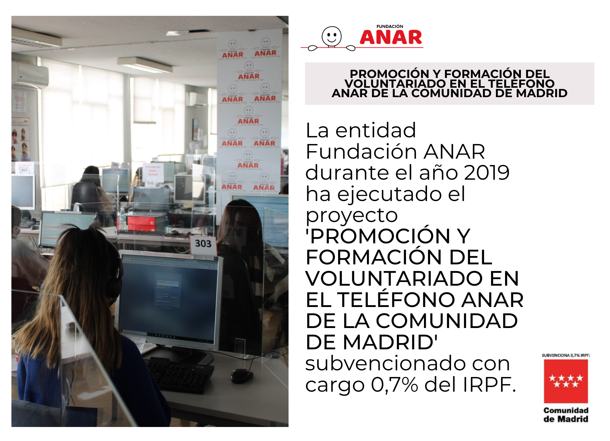 La Comunidad de Madrid ha otorgado a la Fundación ANAR una subvención por el proyecto de ‘Promoción y Formación del voluntariado en el Teléfono ANAR de la Comunidad de Madrid’. Este aporte corresponde al 0,7% del IRPF del curso 2019.