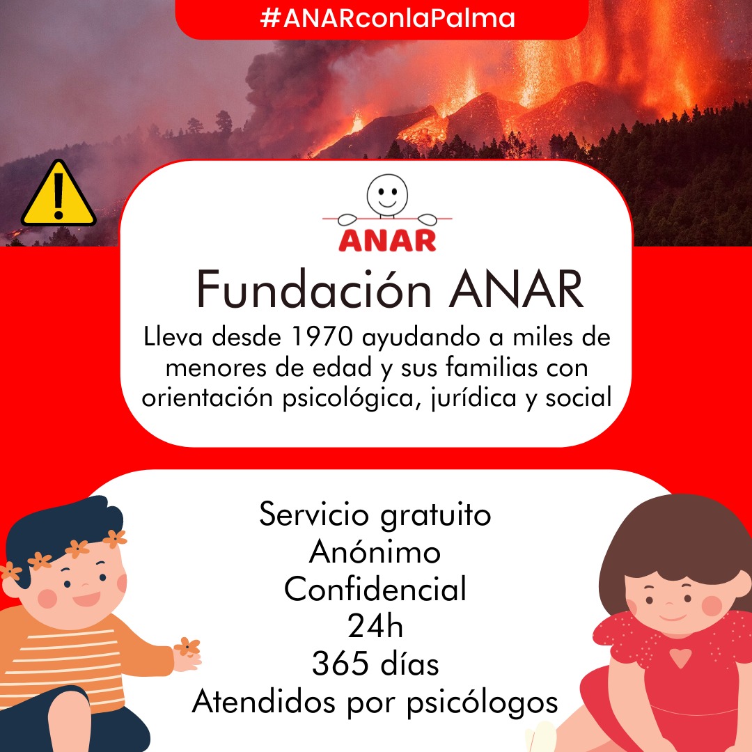 Fundación ANAR, que siempre está cerca de los niños/as y adolescentes en riesgo, ante los terribles momentos que están sufriendo en La Palma, quiere estar aún más a su lado. Por eso ha lanzado una campaña para ofrecer la ayuda de su Teléfono/Chat ANAR a los menores de edad de la Isla.