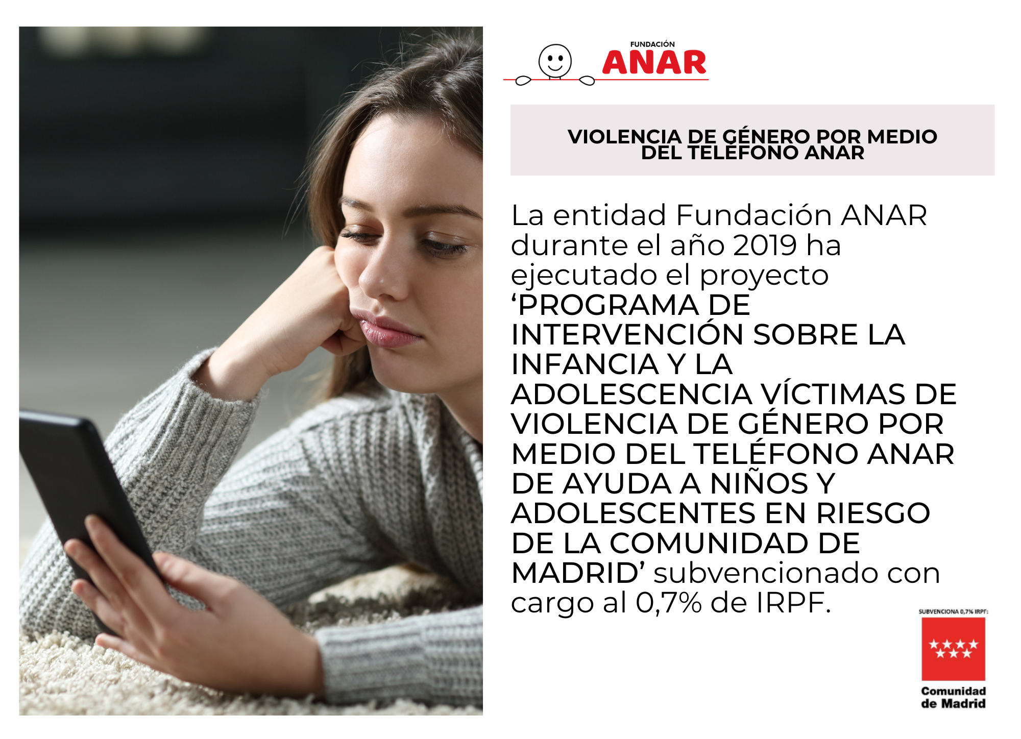 La Comunidad de Madrid ha otorgado a la Fundación ANAR una subvención por el proyecto de ‘Programa de Intervención sobre la Infancia y la Adolescencia víctimas de Violencia de Género por medio del Teléfono ANAR de Ayuda a niños y adolescentes en riesgo de la Comunidad de Madrid’. Este aporte corresponde al 0,7% del IRPF del curso 2019.