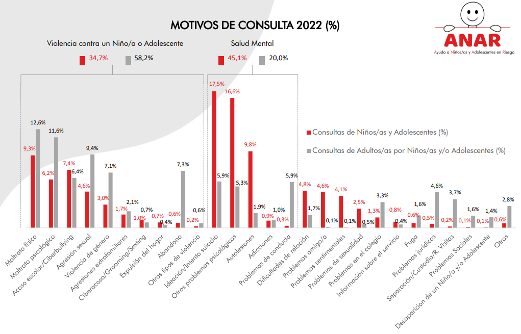 En el Teléfono ANAR de Ayuda a Niños/as y Adolescentes damos respuesta inmediata a cualquier problema que pueda afectar a un menor de edad: dificultades de relación, violencia en sus diferentes formas, problemas psicológicos entre otros. Cualquier niño/a o joven puede marcar nuestro número, que es gratuito y confidencial, y encontrará al otro lado un psicólogo/a que le va a escuchar el tiempo necesario, que le orientará en su problema y que le ayudará a encontrar una solución.