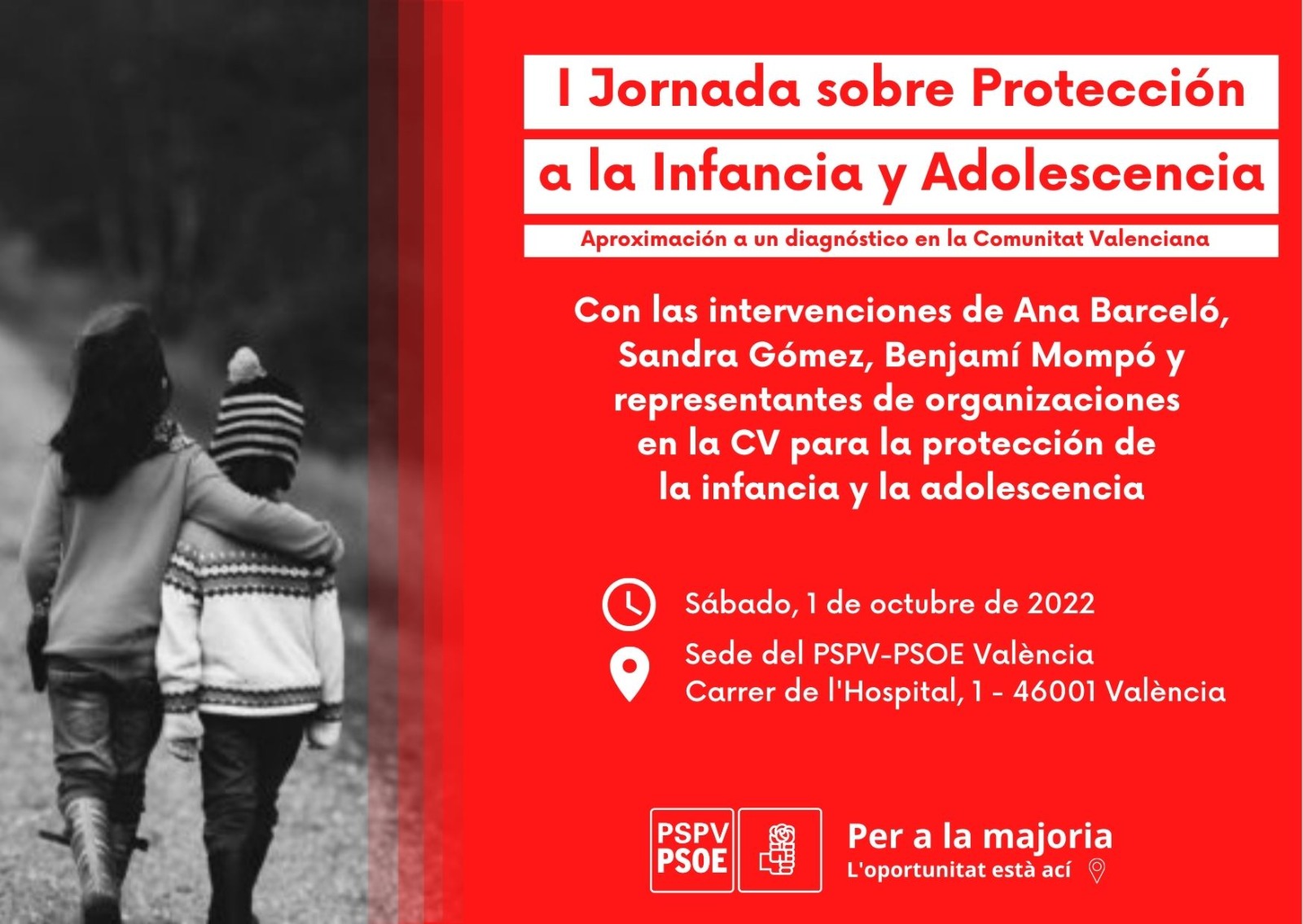 Este acto sobre infancia contará con las intervenciones de Ana Barceló, presidenta del PSPV-PSOE; Sandra Gómez, secretaria general del PSPV-PSOE en Valencia; Benjamín Mompó, secretario general de Joves Socialistes; y varios representantes de organizaciones para la protección de la infancia y la adolescencia, entre las que se encuentra Teresa Martínez, directora de la delegación de ANAR en dicha comunidad.
